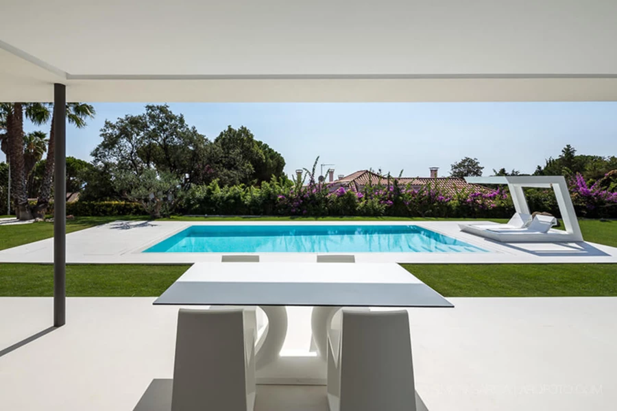 בריכת השחייה מהווה גם היא חלק מה"תימה" העיצובית, פרוסה למרגלות מרפסת מלבנית לבנה , לכל אורך המבנה, ומוקפת במשטח היקפי לבן, רחב.