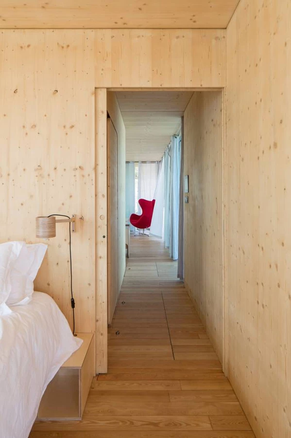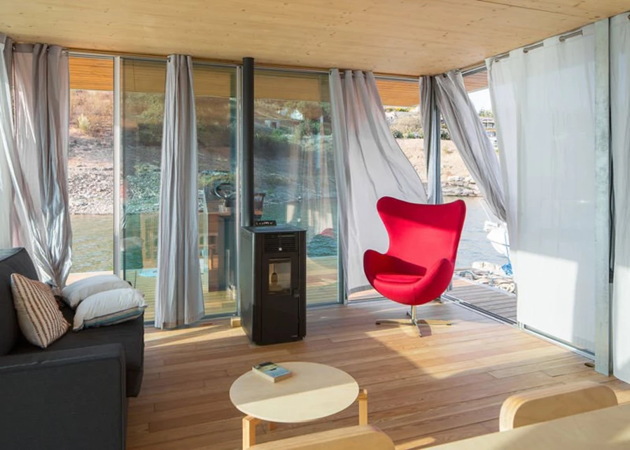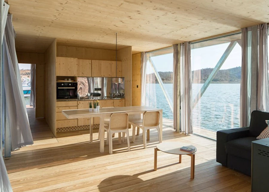 חיפויי העץ, בפנים הבית נותנים תחושת סגנון סקנדינבי, פשטות המתאימה לסביבת המים המקיפה את הבית. לבעלים יש את האפשרות להוסיף תנור גלילי אשר שורף חומרים אורגניים או עץ דחוס, ומעודד חיים בכל עונות השנה בבית הצף.