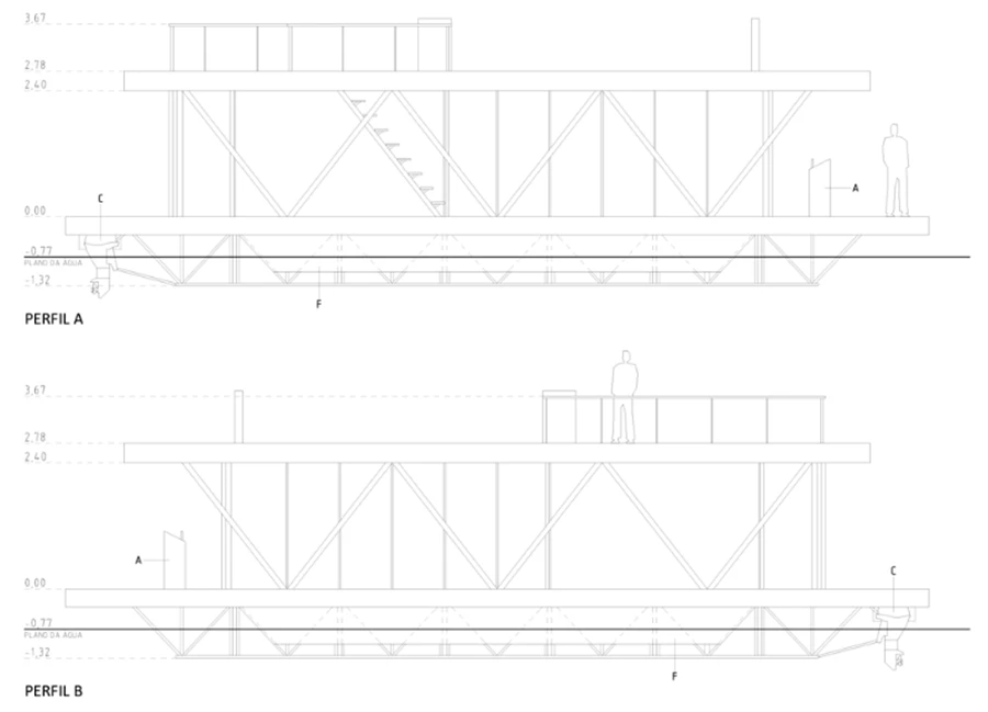 בעוד הרוחב קבוע על 6.9 מטרים, האורך של המרחב הפנימי יכול לנוע בין 10 ועד 18 מטר. "בית הצף" יכול להיות ללא מנוע, ועל מנת לנוע ממקום למקום תדרש גרירה, או לכלול עד שני מנועים חיצוניים המופעלים באופן חלקי או מלא באמצעות אנרגיה סולארית, הבית יכול לנוע במהירות של עד כ-5.5 קמ"ש.