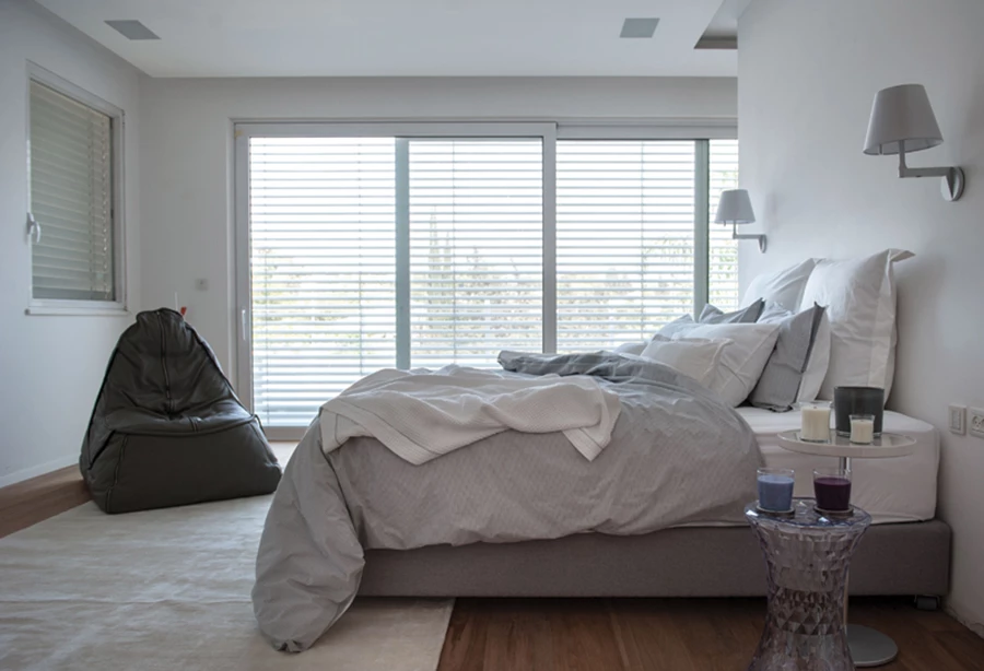 סוויטת השינה הממוקמת מעברו האחד של מעבר רחב בקומה הראשונה. פתח שקוף גדול חושף את הפאטיו המלווה את קומות המבנה, ומרפסת חזיתית צופה אל הגינה והבריכה. ריצוף פרקט ועיצוב נקי שנצמד לגוני האפור והלבן של הבית. פרקט: "פרקטים", דלתות פנים: "חקשוריאן", מצעים וטקסטיל: "אורית וויקטור טראוב".