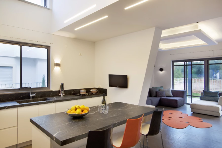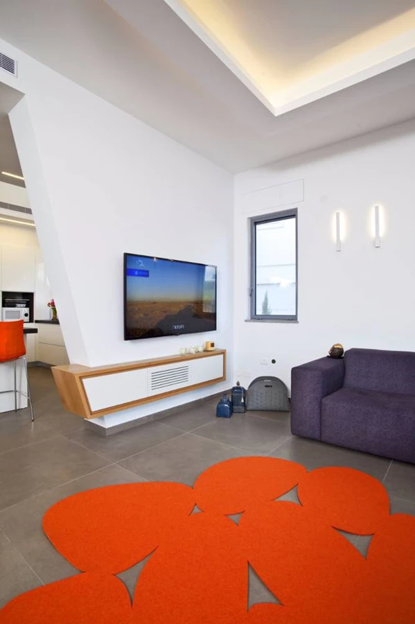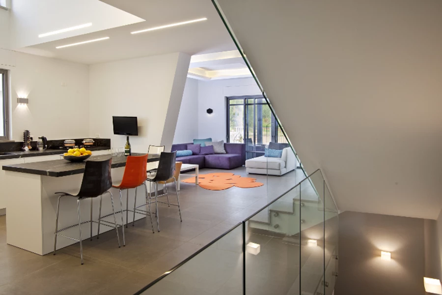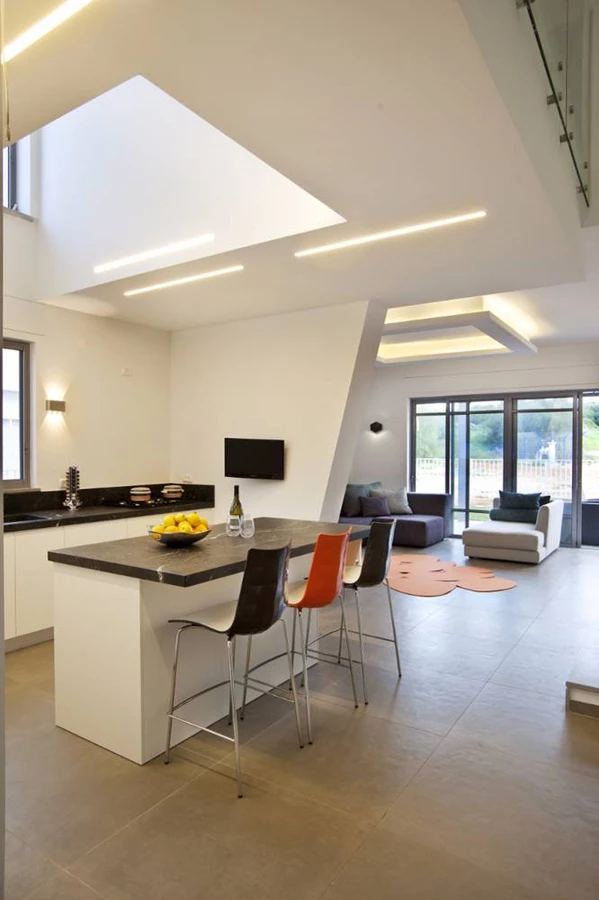 קיר טלוויזיה משופע – בין הסלון למטבח נוצר שיפוע, המייצר גם ממד של תנועה. הקיר בולט כבר מהכניסה לבית ומוביל בצורתו אל המדרגות, שהינן בעלות מבניות משופעת דומה. בתוך כך תפיסת החלל נקראת כתלת ממדית יותר, וקשרי עין נוצרים בין הגשר למדרגות ולמטבח.