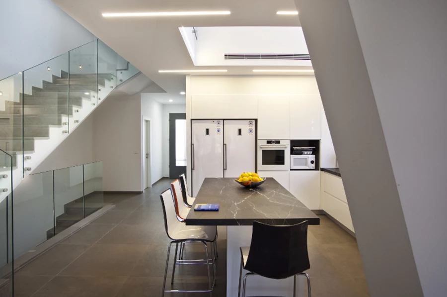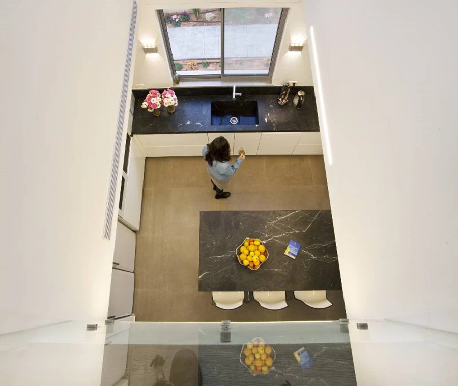 חלל כפול מעל המטבח ויצירת גשר – משני צידי הגשר מתנשאים חללים כפולים: אחד מעל המטבח, והשני מעל גרם המדרגות, כאשר לכך נלווה חלון שנמשך עד התקרה ומחדיר אור למרכז הקופסה המהווה את מרכז הבית. למעשה, אותו גשר, המשמש כמעבר בין החדרים בקומה העליונה, הוא מחולל התנועה העיקרי של הבית. העוברים על פניו חווים את מרכזו של כל הבית – את המטבח, שהוא "לב העניינים". שם נמצאים רוב הזמן ושם מתנהלות השיחות הכי קולחות. "בראשי דמיינתי את הילדים עומדים למעלה ושואלים "אימא, מה יש לאכול?"" אומרת חזקיה.