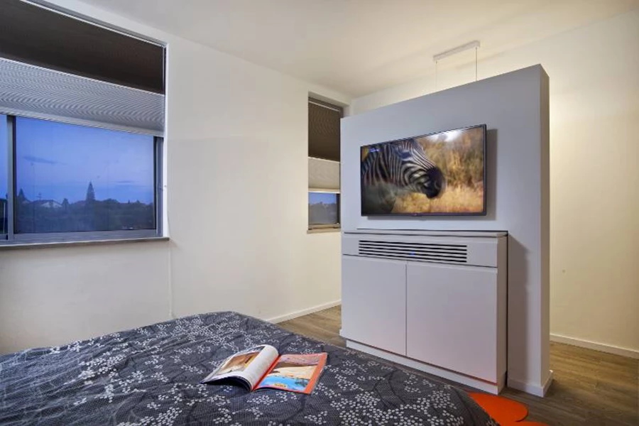 עיצוב חדר שינה הורים – היות ולדיירים לא היה צורך בשישה חדרים, שהיו גם צפופים וחנוקים למדי, הוחלט להגדיל את חדר השינה על חשבון ויתור על אחד מחדרי הילדים. בנוסף, בחללו תוכנן קיר מרכזי נמוך המסתיר את הכניסה לשירותים הצמודים, כך שניתן להתרשם נכונה מגודל החדר. בקיר, שנועד לתליית מסך הפלזמה, שולבה נגרות אומן, והחלון שבחלל הוגדל ותוכנן כפתח פינתי ענק המשקיף אל הנוף המרהיב, ואף מחדיר אותו פנימה תוך תחושה של טבע אינסופי.
