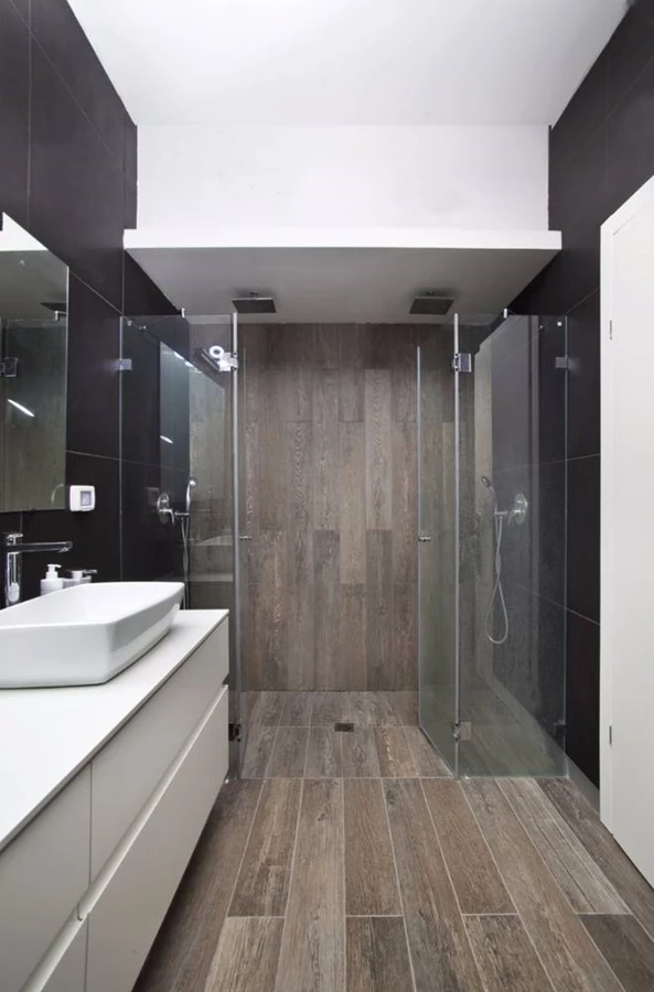 עיצוב חדר רחצה הורים– בדומה לחדר ההורים שהוגדל, כך הוגדל גם חדר הרחצה שלהם תוך יצירת חלל בעל פרופורציה מלבנית ולא ריבועית כפי שהיה קודם לכן. במופעו זה של החלל חוזק קונספט התנועה, וריצוף הפרקט שמשמש בו נבחר עם "כיווניות" לאורך הצלע הארוכה. הריצוף ממשיך ועולה על הקיר בתוך המקלחון הזוגי, וכך,למעשה, הרצפה הופכת לקיר ולהיפך.
