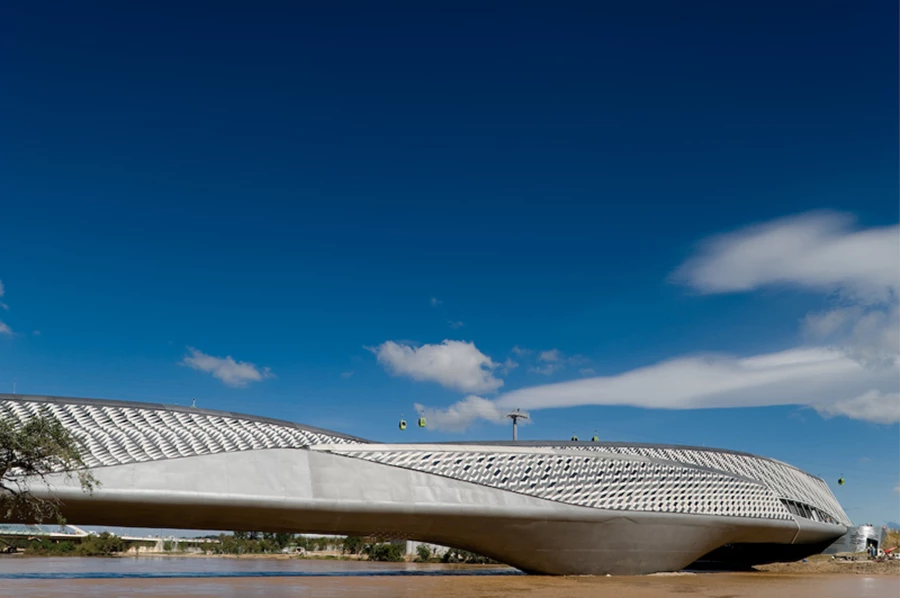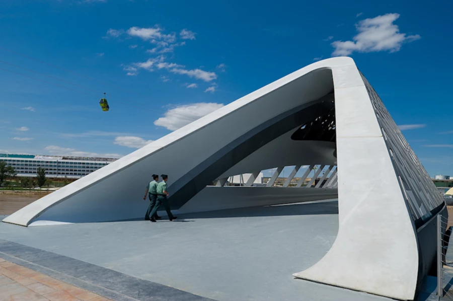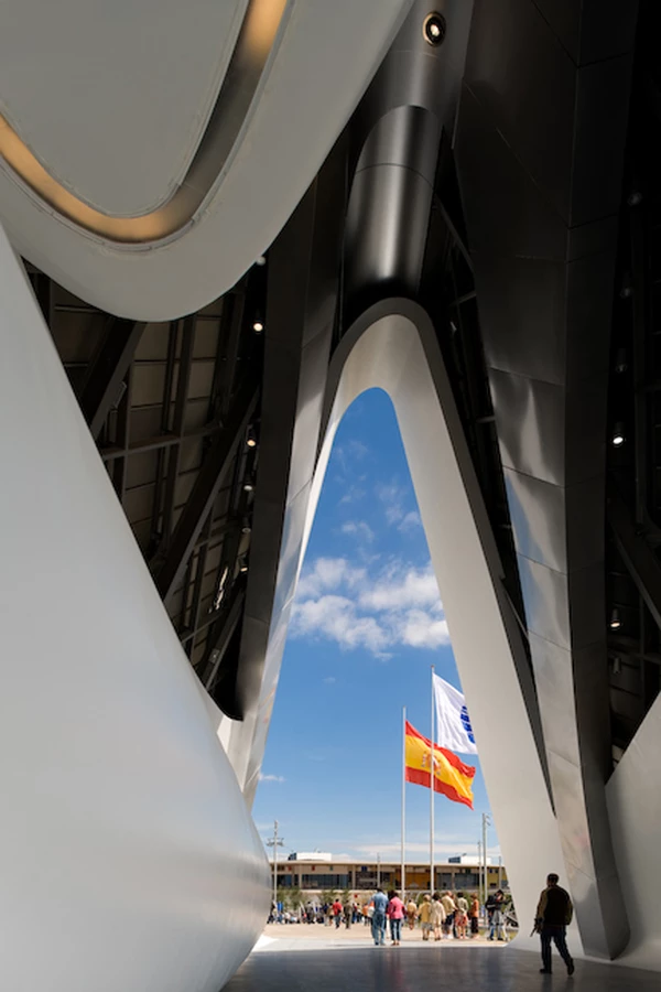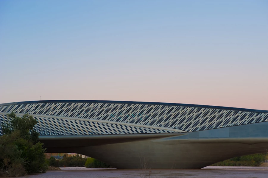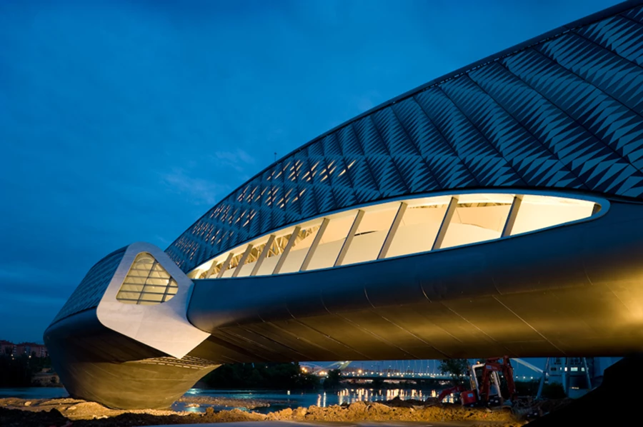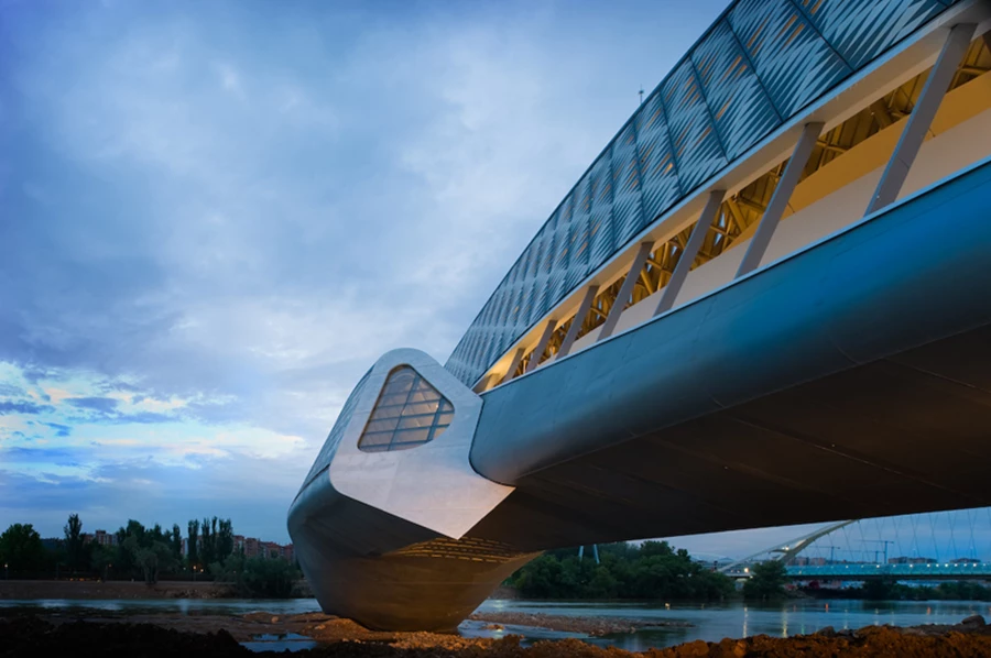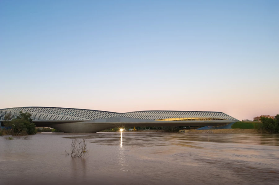 פביליון וגשר סרגוסה הינו תוצאה של בחינה ומחקר מעמיק של הפוטנציאל הגלום בחתך שצורתו יהלום, אשר מציע יתרונות סטרוקטורליים ופרוגרמתיים כאחד. תהליך החיפוש הצורני היה כרוך במיזוג בין רעיון אדריכלי עוצמתי של ארבעה "תרמילים" מאורכים המכילים חללי פנים וחוץ, לבין מערכת הכוחות הסטרוקטורליים והדרישות הנובעות מן הטיפולוגיה של מבני גשר. על ידי אקסטרוזיה של חתך שצורתו יהלום לאורך ארבעה קווים עקמומיים מעט, נתקבלו ארבעת התרמילים המאורכים המרכיבים את פביליון הגשר.