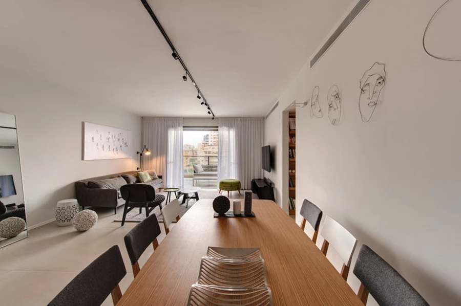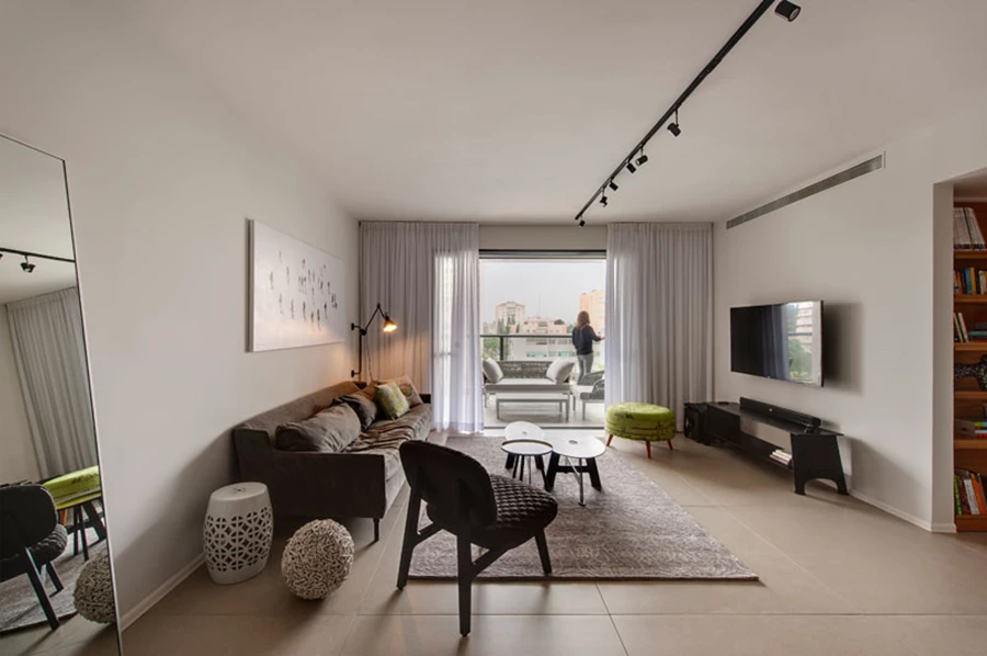 לסלון נבחרו גוונים מונוכרומאטיים, ועיצובו המשלב פריטים שונים מייצר מראה קליל ולא מחייב, גמיש לשינויים ונונשלאנטי משהו: ספה רחבת ידיים, כורסה בריפוד שונה המאופיין בטקסטורה תל ממדית, עירוב של שולחנות מסוגים שונים מברזל ואימייל, (ריהוט סלון –קסטיאל AS IS) שטיח מודרני עם נגיעה מעט אותנטית של עבודת יד ייחודית (צמר שטיחים), ויחידת אודיו מברזל (קסטיאל) היוצקת נופך תעשייתי כלשהו. הסלון והחלל הציבורי כולו מוארים באמצעות פס צבירה (דורי קמחי) ארוך הנחלק לאזורי תאורה אותם הגדרנו מראש, כאשר גונו השחור מתבל את המראה בממד דרמטי ושונה.