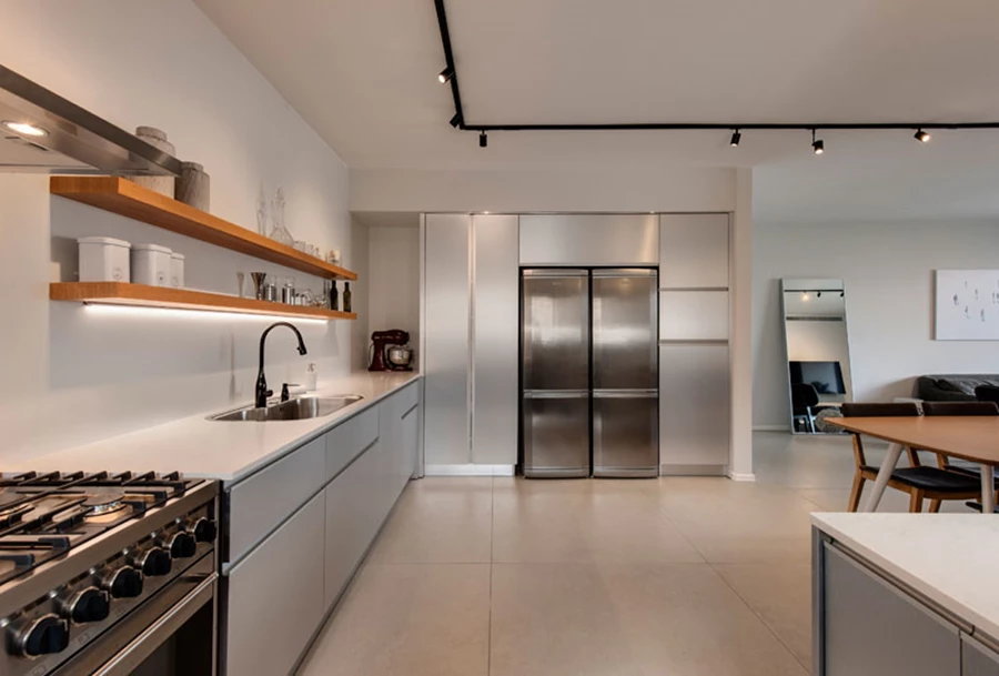 המטבח הורחב על חשבון מרפסת הכביסה, כך ששטחו גדל משמעותית לכדי אזור נוח המספק את צרכי בעלת הבית. חזיתות המטבח עוצבו עם ציפוי אלומיניום המספק מראה תעשייתי ,משטח העבודה רחב הידיים (פרביטל) הוא במראה שיש, וחיפוי הקיר בוצע באריחים לבנים 100/100 דקים (חזי בנק) נוחים לתחזוקה שמייצרים מראה נקי. יחידת בישול ואפיה גדולה (smeg) וזוג מקררים במראה תואם משלימים את החזות המעוצבת, וכיור נירוסטה של חברת FOSTER בשילוב ברזים (KWC, ויה ארקדיה)שחורים מספקים מראה יוקרתי במיוחד. לכך, אגב, מתלווה סיפור של "מבצע" מיוחד: היות והספקים המקומיים לא מספקים את הסבונייה בצבע שחור, הלקוחה הזמינה אותה בארה"ב, וכששהיתי בניו יורק לצרכי עבודה היא נשלחה אלי למלון ו"חזרה" איתי לארץ כדי להשלים ולהדק את מראה הברזים.