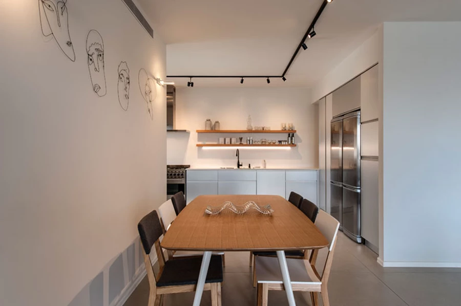 פינת האוכל (קסטיאל AS IS) הוצבה בצמוד למטבח מתוך כוונה להשתמש בה בחיי היומיום ולא רק לארוחות חגיגיות, ועל הקיר שולבה עבודה אומנות של מעצב צעיר שנקנתה בשוק הפשפשים (אפרו).