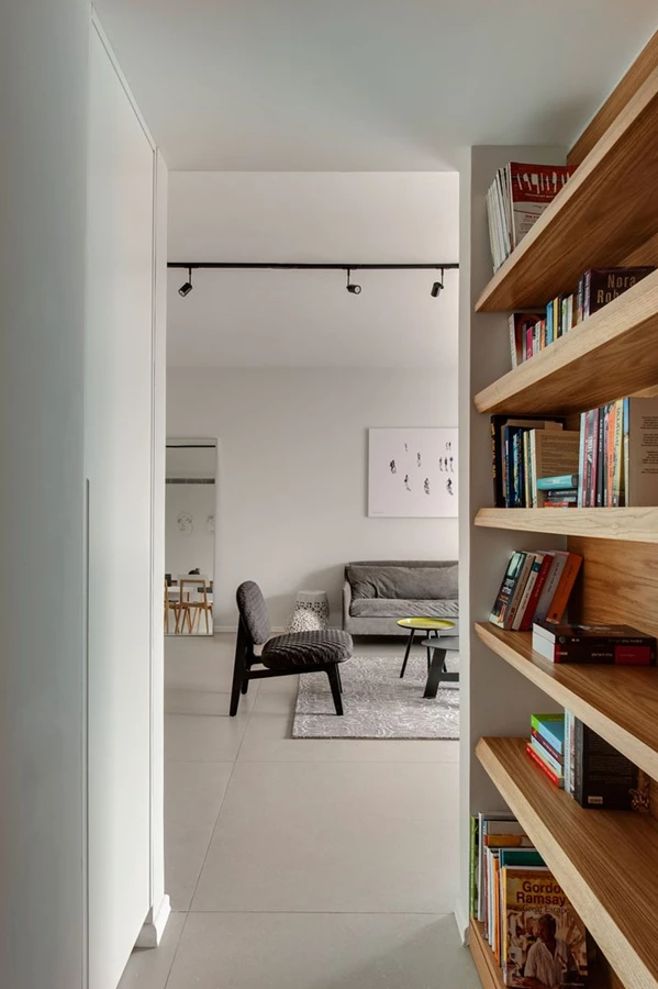 המעבר אל האזור הפרטי בבית הוא דרך מסדרון, אשר בכניסה אליו שולבה ספרית עץ לאחסון ספרים ופריטי נוי אותם רוכשת הלקוחה בעת טיוליה בעולם.