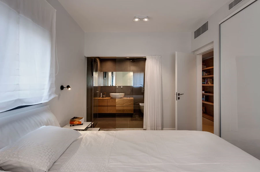 חדר השינה רוצף בפרקט (ויה ארקדיה) ובחללו שולב חדר רחצה פתוח החשוף/נחשף אליו באמצעות קיר זכוכית המאפשר כניסת אור תמידית, מספק תחושת מרחב ואווריריות, ובעת הצורך ניתן לסגירה עם וילון. חדר הרחצה עצמו חופה באריחים גדולים (ויה ארקדיה) בגוון אפור וביחידת הכיור משתלב עץ אלון המספק חמימות לחלל .