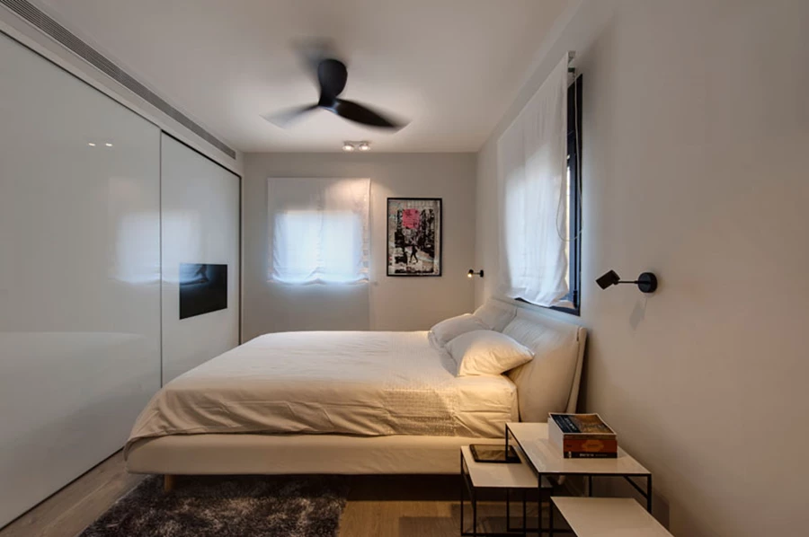 לחדר השינה נקנתה מיטה (אליתה ליווינג) המשלבת בעיצובה חומר ייחודי ובד מקורי במראה של עור, ושולחנות הלילה מעוצבים בגמר אמייל בגווני שחור ולבן (קסטיאל AS IS). בארון שנבחר מוטמע מסך טלוויזיה, ואת התקרה מעטר מאוורר תקרה שחור.