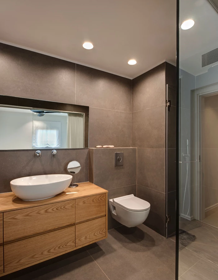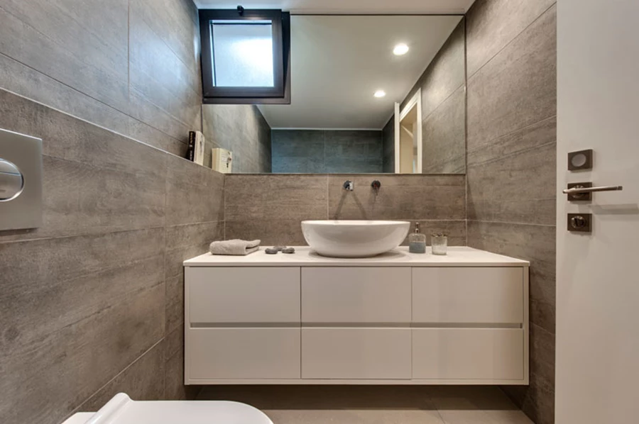 בהמשך המסדרון ישנו חדר רחצה נוסף שחופה באריחים דמוי בטון (ויה ארקדיה) ובחללו משתלבים אמבטיה לרחצה מפנקת וארון לבן גדול.