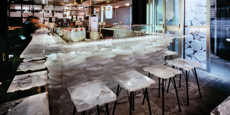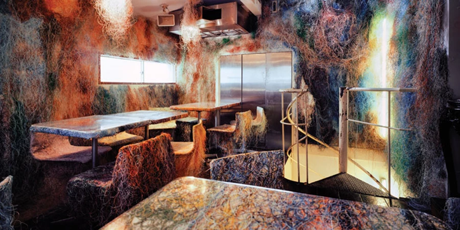 במבט ראשון הקומה השנייה נראית כאילו עברה הפצצה של חוטים: המעצבים עשו כאן שימוש מיוחד בכבלי רשת למחשבים על הקירות, על המנורות, על הכסאות ועל השולחנות. בקומת הקרקע נמצא הבר בו עשויים גם השולחנות וגם הכיסאות משאריות של אקריליק שקוף שהומס, תוך יצירת מראה כשל אובייקטים עשויים קרח וצפים באוויר. את הקירות מעטרים ציורי קיר של האמן Teruhiko Yumura.