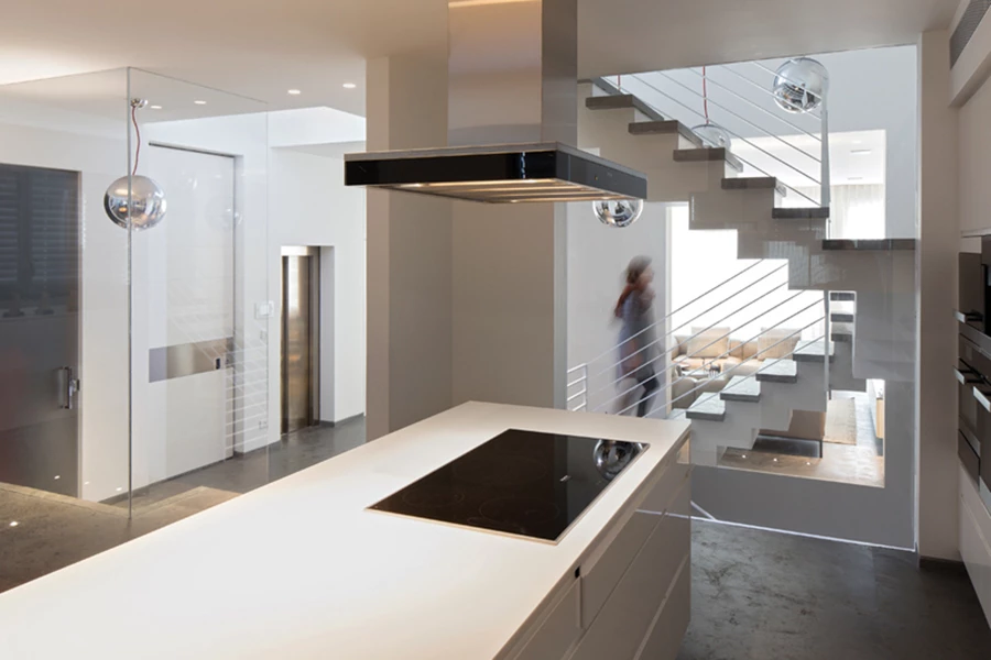 מבט מהמטבח אל עבר גרם המדרגות: מדרגות מנותקות ומחיצות שקופות מייצרות מראה אוורירי.