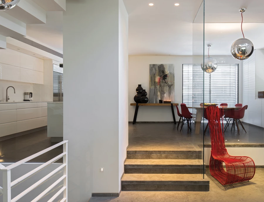 מבט מעומק חלל המגורים לעבר מרחב הקומה: אזור המטבח מוגבה מעט ממפלס הריצוף ומחיצות שקופות מאפשרות קיום קשרי עין ישירים בין האזורים. ריצוף: אריחי אבן גסים במרקם מט.