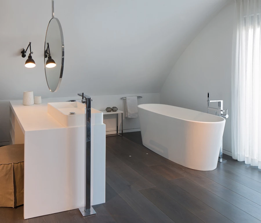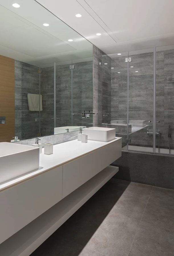 כך, לדוגמה, המיטה, כמו גם אמבט "הפרי סטנדינג" שאינם דורשים "גובה מלא" הוצבו באזורים נמוכי התקרה. בין המיטה לבין האמבט משתלבת יחידה נמוכה המשמשת כיחידת כיור באזור הרחצה וכיחידת איפור באזור השינה, ופרט מרשים הוא האופן בו שילבו לנצ'יאנו וסלע את המראה הנדרשת בשני הצדדים: מראה עגולה גדולה שמעוגנת לתקרה באמצעות מוט מתכת, כך שהמראה המתקבל הוא כשל מראה מרחפת.