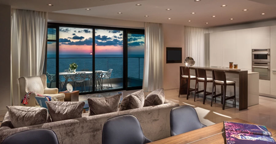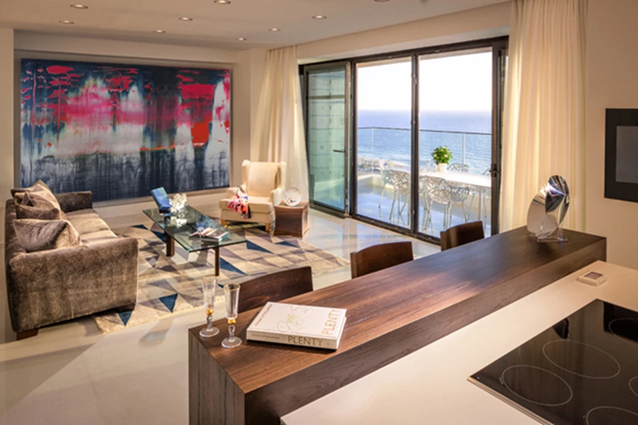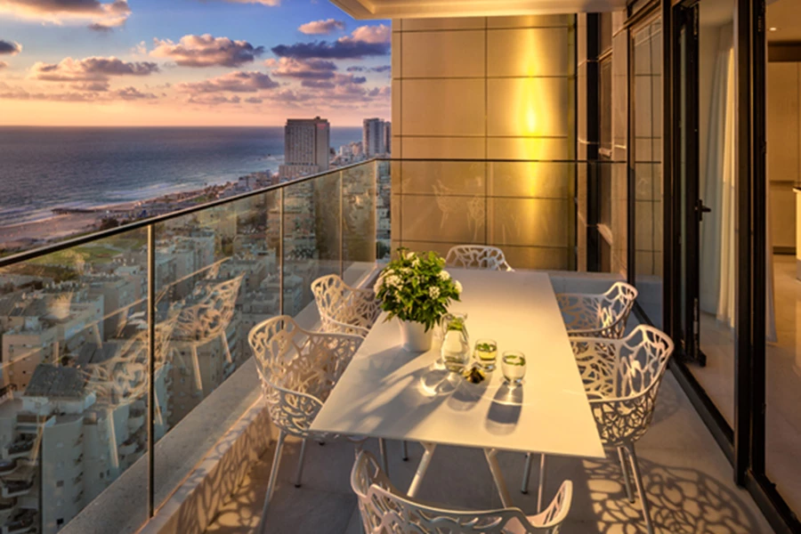 המרפסת הצופה אל נוף הסביבה אינה נופלת בחזותה המעוצבת מחלל הפנים, ומשלימה את תחושת היוקרה המפנקת עם הזמנה להסב מול יפי הים וליהנות גם כאן מנוכחות כחולה...