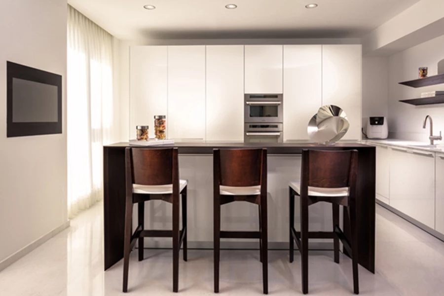 המטבח המהווה חלק בלתי נפרד מהחלל הציבורי עוצב עם חזיתות בציפוי חומר אקרילי מבריק המקנה לו חזות אלגנטית, וכחציצה כלשהי בינו לבין אזורי החלל האחרים משמשת יחידת אי צפה אליה חובר דלפק ישיבה שכמו "רוכב" עליה ומעוצב מעץ אלון מושחר עם שילוב פס אלומיניום בחיבורי הפאות. כיסאות הבר שהותאמו לו עשויים אף הם מעץ, וכך גם שולחן פינת האוכל והכיסאות שנבחרו עבורו המשלבים רגלי עץ וריפוד בגון כחול דיו בעיצוב עוטף, נוח ומזמין.