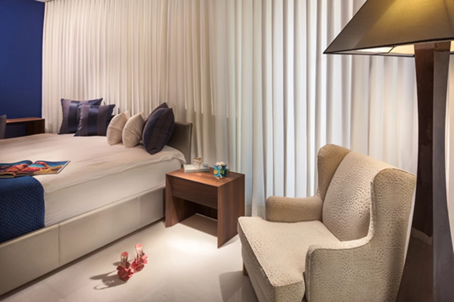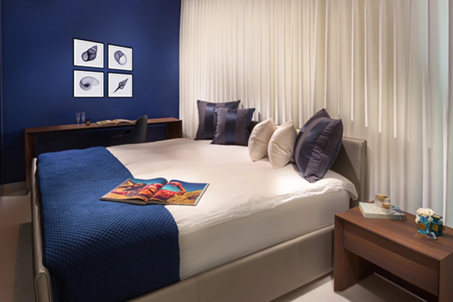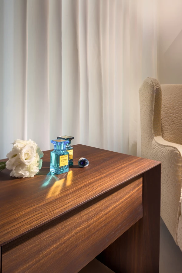 בסוויטת השינה רחבת הידיים שהתקבלה מאיחוד שני חדרי שינה גדולים למדי נצבע אחד הקירות בכחול המהדהד את נוף הים ומייצג את הנגיעות הכחולות של שפת העיצוב, ובשטחה המרווח משתלבים גם כורסה מפנקת ומנורה עומדת מרשימה שיוצקים ארומה "מלונית". חדר הרחצה הצמוד שאף שטחו הורחב ע"ח חדר ארונות, חופה בשיש בטכניקת "Cut to size" ויחידת הכיור שבוצעה בעבודת נגרות עוצבה כיחידה צפה א-סימטרית במשחק גבהים משתנה. הכיורים, שאף הם בוצעו בהזמנה, עשויים אבן בחיתוך לייזר, והמראה כולו אומר תחכום וקפידה מסוגננת עד אחרון פרטיה.