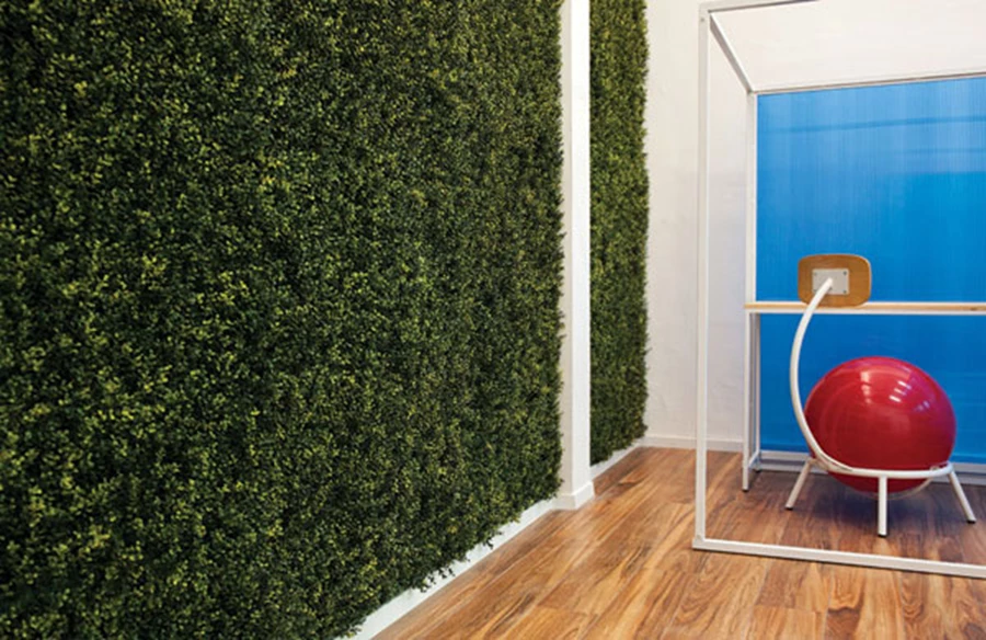 בעומק חלל הכיתה: חללי למידה אישיים, ריצוף פרקט, וקיר מחופה משטחים תלת ממדיים המדמים מראה של צמחייה ירוקה רעננה.