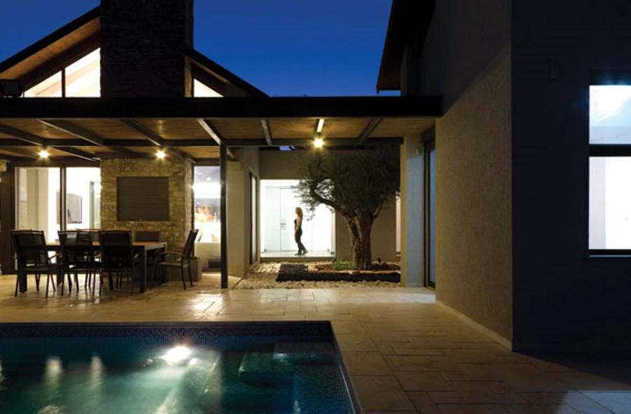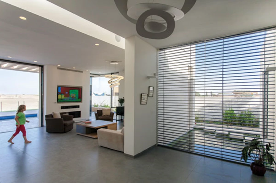 באמצעות החלון העליון נהנה החלל מאור דרומי מרוכך למרות הבעייתיות הנובעת ממיקומו הגיאוגראפי של הבית בנגב, כמו גם מסירקולציה מוגברת של אוויר צח המפחיתה את הצורך להשתמש במזגן. "חריץ האור" של הסקיילייט מגדיר את החלל הציבורי ומייצר הבחנה ברורה ובעלת עניין בינו לבין המבואה ושאר אזורי הבית.