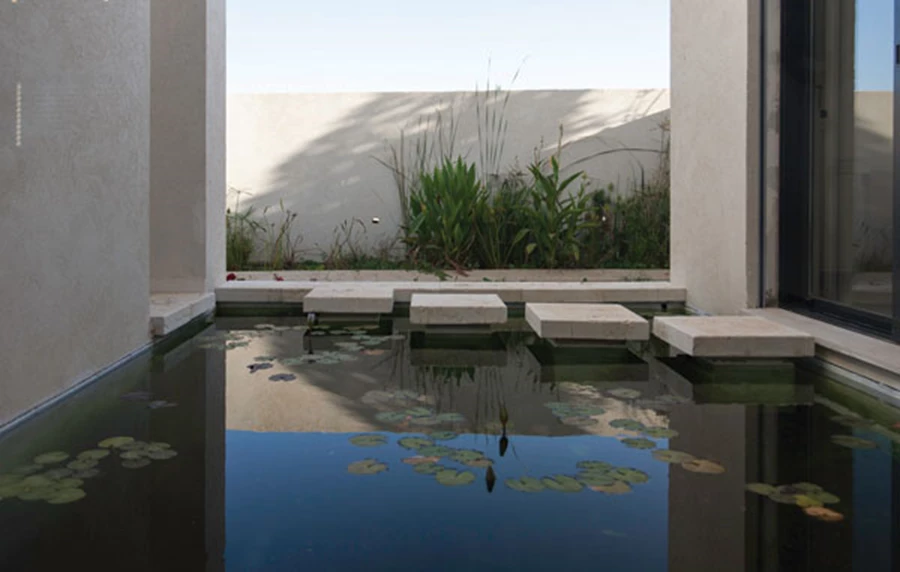 מבואת הכניסה לבית מתפקדת כחלל ביניים שירותי המכיל פונקציות אחסון, ארון חשמל וכד', אשר סופו נתחם בחלון ענק החושף בריכת נוי ובחלקו העליון נפרץ חלון שפונה לכיוון דרום. מראה בריכת הנוי הנגלית מהכניסה מייצר אפקט חוויתי-ויזואלי מרהיב, בפרט בשעות הבוקר כשקרני השמש משתקפות במימיה ומרצדות על התקרה, כאשר שילוב המים באזור זה מייצר מיקרו אקלים המצנן את האוויר.
