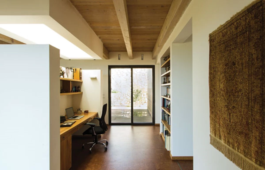 אינטימיות והתנתקות מהמולת הבית מחד, ותחושת קשר מאידך, כערכים שמשתלבים בפינת עבודה החולקת מרחב משותף עם הסלון וממוקמת על גב קיר הטלוויזיה שבשטחו.