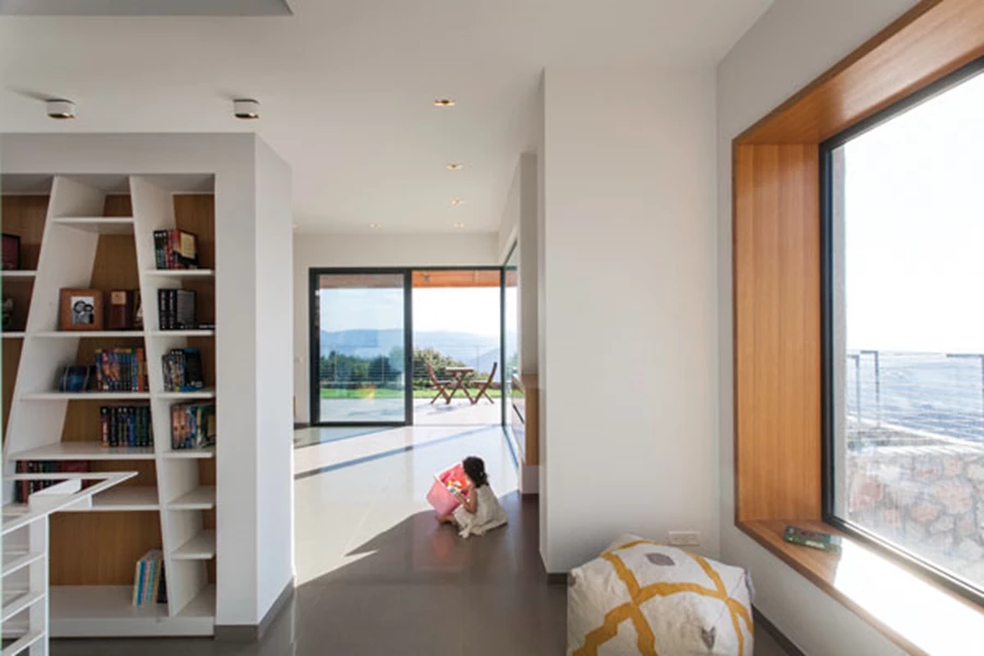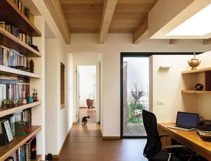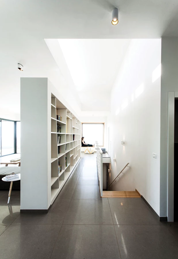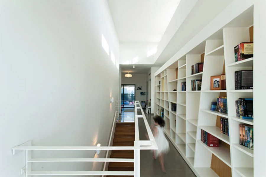 מדף ספרים בגובה העיניים שמלווה את כל אורכו מעניק פתרון נדרש נוח ונגיש לאחסון ספרים, ו"על הדרך", תרתי משמע, מייצר עניין ומאציל על החלל תוכן נוסף. שורת חלונות עליונים מהווה מקור לשחרור חום ושיפור האוורור, כמו גם להחדרת אור במקביל לחדירתו דרך חלון הסרט הנמוך.