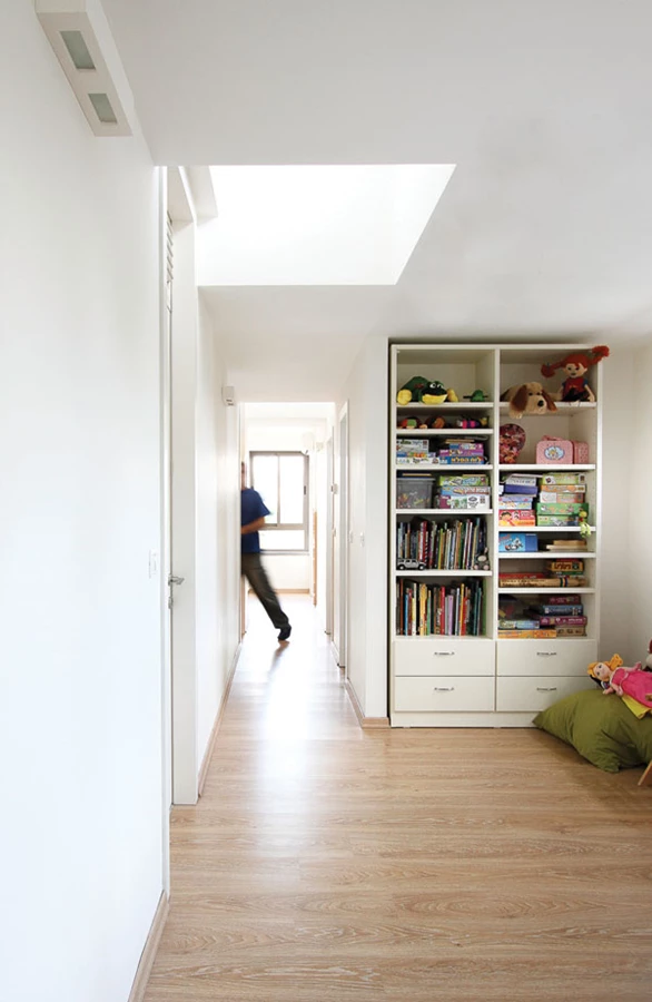 חלל המסדרון מאכלס לאורכו 4 חדרי שינה, 2 חדרי רחצה, חדר כביסה, פינת טלוויזיה ופינת משחקים, כאשר 3 פתחי סקיילייט ה"משובצים" בתקרתו מהווים בארות אור טבעי, כמו גם אמצעי לשחרור חום והגברת סירקולציה של אוויר צח בחלל הקומה.