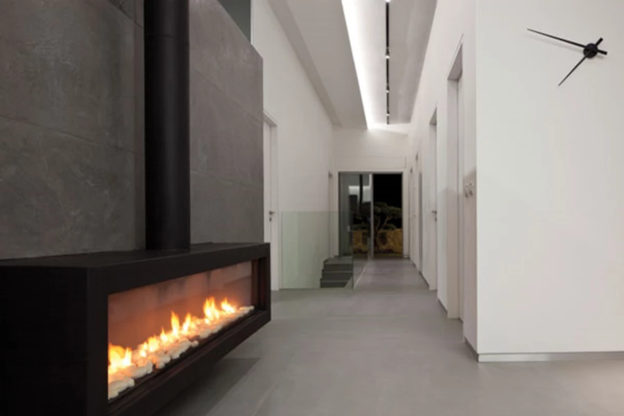 בקיר התוחם את מבואת הכניסה מותקן קמין, ומשני עברי חללה משתרעים האגף הציבורי והאגף הפרטי.