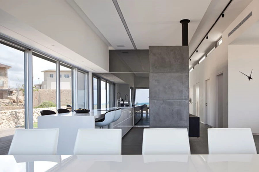 צללי האור וההשתקפויות שהוא מייצר חודרים לכל רחבי הבית תוך יצירת עניין דינאמי ומשתנה, וכך גם התנועה במעברים הפותחת קשת של מבטים מקרוב לרחוק ולכלל אזוריו.
