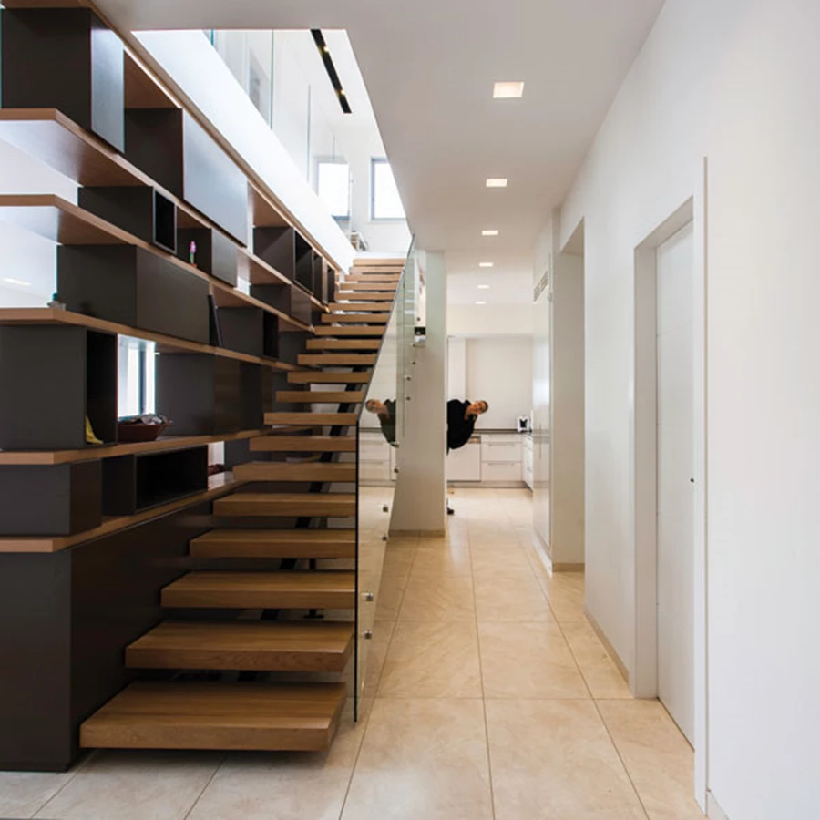 המדרגות הקלות שמקשרות בין שתי הקומות אינן צמודות לקיר: צדן האחד פתוח למעבר בין חללי שירות שונים, והשני תחום בספרייה דו כיוונית ושקופה למחצה שמשמשת גם כ"גב" לסלון ומייצרת עניין בזמן העלייה לקומה העליונה- אם באמצעות החדרת אור, אם באמצעות הספרים וחפצי הנוי שמדפיה מאכלסים, ואם באפשרות להציץ מטה לחללי הקומה התחתונה. מעל המדרגות קבוע פתח דרומי המלווה את כל מהלכן ומחדיר דרכן אור לחללי ה"ליבה" החשוכים ביותר של הבית.