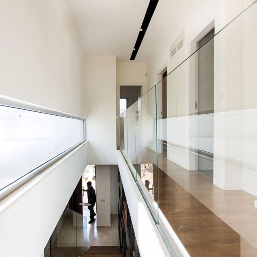 בקומה העליונה צדו האחד של הגשר גובל בחלל כפול של הסלון, וצדו השני תחום בחלון סרט נמוך המאפשר תנועה חופשית "מצד לצד" ללא חשש להיחשף מבחוץ "רואים רק את הרגליים" לדברי האדריכלים.