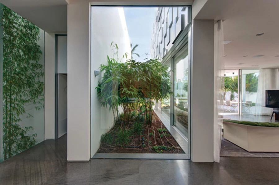 המעבר ליחידת ההורים הממוקמת מעברו השני של הקיר התוחם את הפטיו החיצוני, מופרדת לחלוטין מהחלל הציבורי. בעומק נראית חצרה הפרטית, ומשמאל פטיו פנימי שמלווה את גרם המדרגות ומחדיר נוף צמחייה ירוקה שנשתלה בתוכו. מוצרי יוקרה ואביזרי פנים: קליינס'.