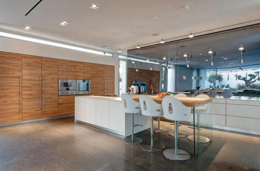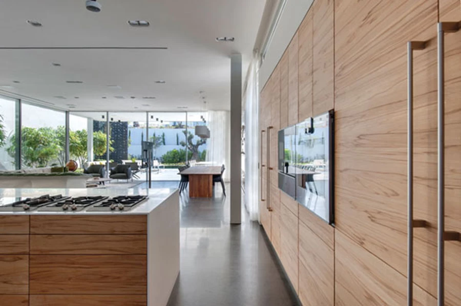 המטבח: תחום בין קיר מראה לבין יחידת אי, מעניק קשרי עין ישירים עם החוץ ומשלב עץ אגוז... וזכוכית לבנה. יחידת הכיור צמודה לקיר המראה ממנו מגיחים גופי תאורה מעודנים, ויחידת קיר מרשימה על טהרת השימוש בעץ נוסכת נוכחות חמימה. מטבח: פנומנה (TEAM7), אביזרי מטבח: תותחני בע"מ