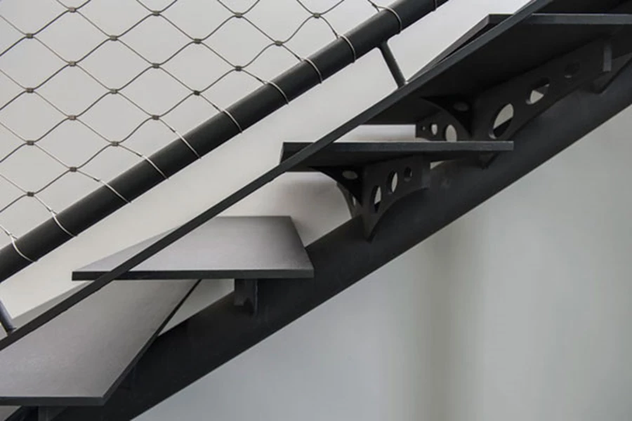 גרם המדרגות: קונסטרוקציית ברזל ומדרכי ברזל מעוצבים כמשולשים מעודנים בחיתוך לייזר. המעקה משלב מאחז יד עשוי עץ ומסגרת מפרופילי ברזל עגולים שבתוכה, אך במנותק ממנה, אחוזה רשת מתכת