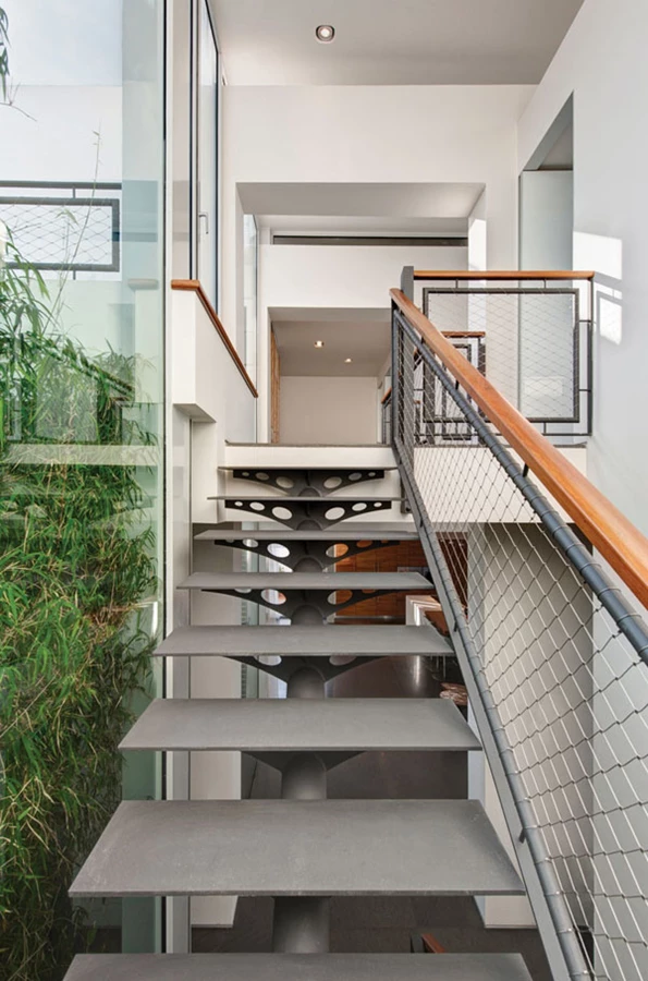 חלל המדרגות המוליך לקומה העליונה תחום-מלווה בפטיו נוסף, פנימי, ה"פותח" אותו וזורם לכל גובה הבית כשהוא מחדיר פנימה אור ואוויר, כמו גם נוף ירוק של צמחייה שנשתלה בתוכו. הגרם עצמו, אחד האלמנטים שתכנונם אהוב על וליקסון ועזוז במיוחד, משלב קונסטרוקציית ברזל ומדרכי ברזל מעודנים מעוצבים כמשולשים שיוצרו בחיתוך לייזר, ומעקה יצירתי עשיר למראה: מאחז יד עשוי עץ ומסגרת ברזל מפרופילים עגולים שבתוכה, אך במנותק ממנה, משתלבת רשת מתכת.