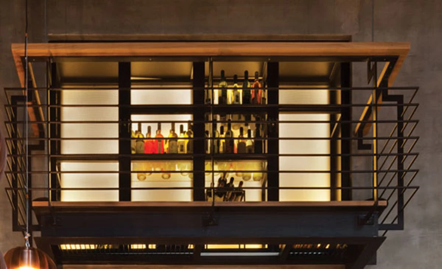 הליך זה, מסביר הלפרין "העמיק את ההבדלים בין הלוחות ואף העצים את ערכי הברק שלהם, וכתוצאה מכך החזרי האור המתקבלים מהם שונים". היינות המשובחים אוחסנו בארון העליון, ולצורך הגעה אליו שולב בבר סולם לשירות המלצר המטפס עליו לעיני כל, ובכך מעניק למראה המרשים גם ערך חווייתי וסוג של קריצה.