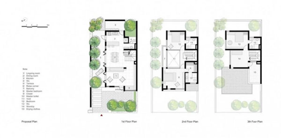 לדברי האדריכלים, החלל הגדול נוצר באמצע הבית על מנת להשיג קישוריות אופקית ואנכית טובה יותר. שתי קוביות המורכבות מרפרפות עץ צפות בחלל ומהוות נקודה מרכזית בבית.