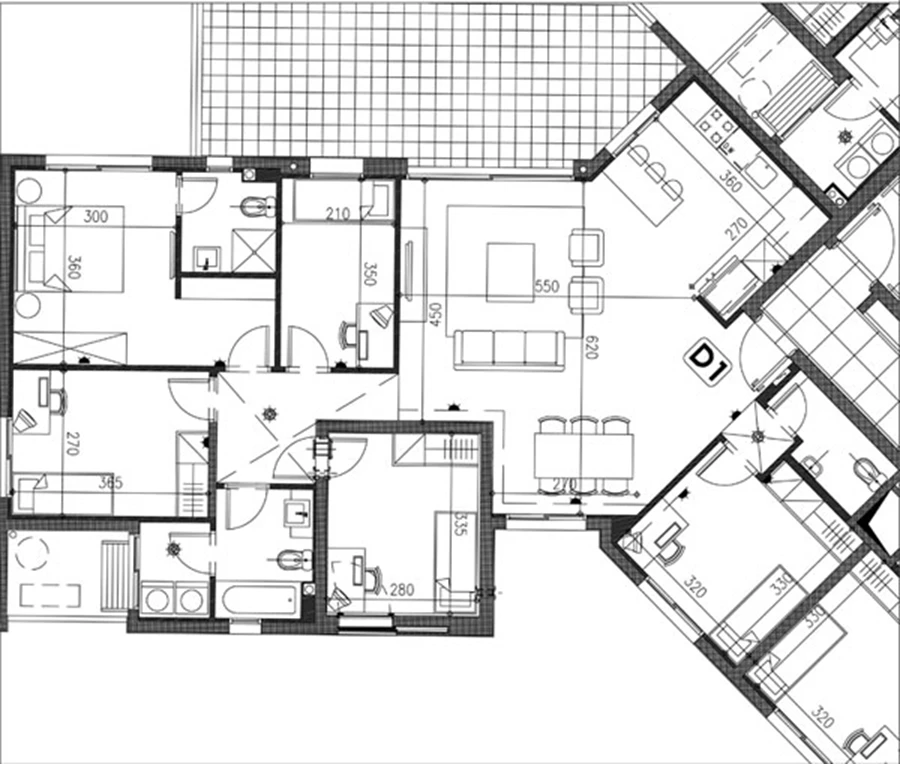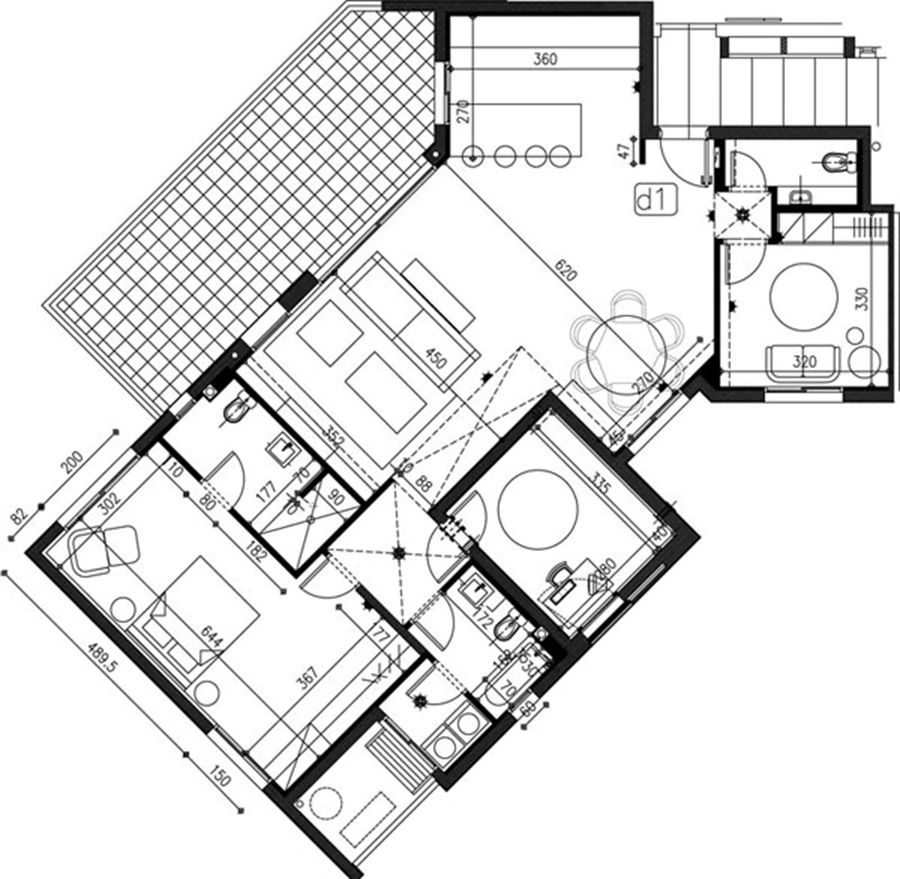 הבניין מאופיין בתצורת כוכב שיצרה את מתארה כאלכסוני משהו, ובתוך כך גם הכתיבה את פרישת חללה כפי ש"פגשו" אותו יפית ודדי, שנכנסו לתמונה בשלב בו מחיצות הפנים כבר עמדו על תלן. ואולם, בתכנית שרקמו בעצה אחת עם בעלת הבית הוחלט לוותר על חדר וחצי לטובת פרישת חלל חדשה שהוגדרה כמתאימה יותר לצרכים ולהעדפות, ואף זיכתה את הדירה כולה בתחושת מרחב גדולה יותר: חצי החדר סופח לסלון והגדיל את שטחו, וחדר השינה אוחד עם שטחו של חדר סמוך תוך יצירת יחידה מרווחת, הכוללת גם חדר רחצה מפנק שהתקבל כתוצר של הגדלת חלל הרחצה הקטן שנכלל בחדר במקור (ראה תוכניות).
