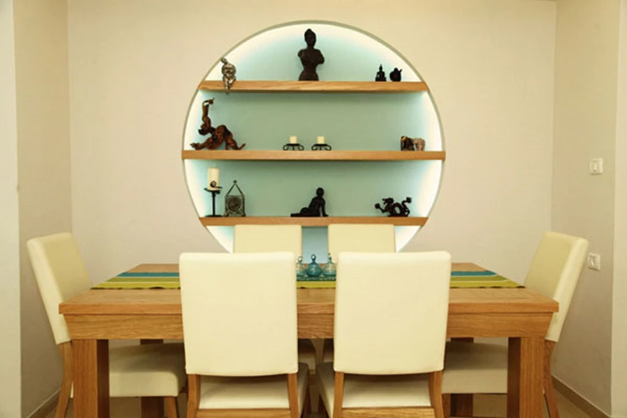 בפינת האוכל תכננו נישה עגולה מגבס, אשר בשילוב תאורה נסתרת וצבע כחול אפרפר, היא תורמת לזרימה ולשלווה לפי חוקי הפאנג-שווי. באותה נישה ריכזנו אביזרים שונים ממסעות הזוג ברחבי העולם.