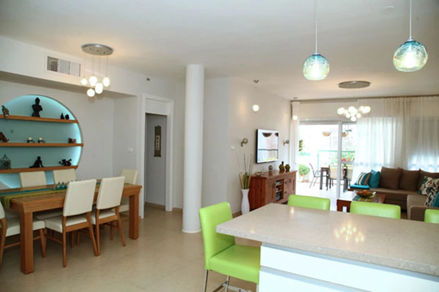 בין המטבח לסלון מפריד אי גדול שמשמש לארוחות קטנות, כסאות בר ירוקים וגוף תאורה משלימים את המראה המיוחד.