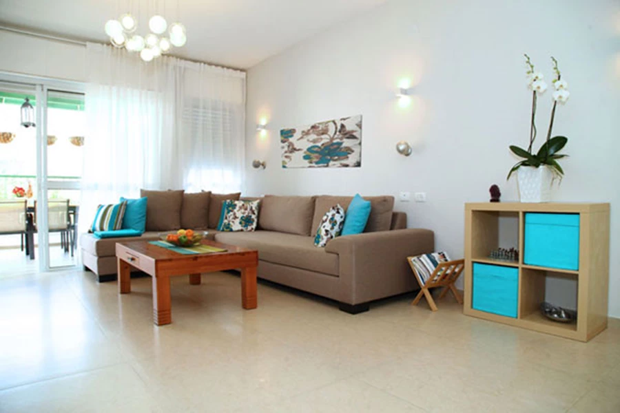 הסלון נקנה בדרום ת"א ושולבו בו כריות דקורטיביות שנצבעו בצבעי הבית בהזמנה מיוחדת. השולחן והמזנון מעץ בוק הם השרידים היחידים שנותרו בדירה.