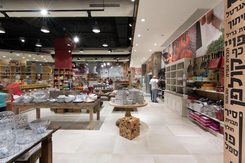 בנוסף, בגלל צורת המתחם היה קושי ממשי בתכנון התנועה בחלל, ומכאן נולד הרעיון של אלמנט הקופות, המשולב עם עמדת שף בכניסה ועם שטחי מכירה ותצוגה. אלמנט שמייצר "סדר" בחלל וגורם לאנשים לנוע סביבו ולהגיע לכלל המחלקות בחנות.