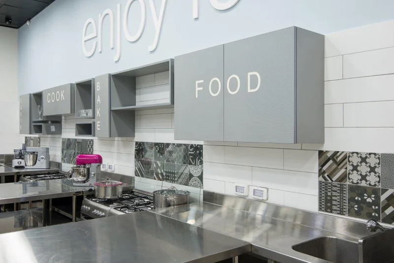 בחלל האקדמיה עצמו השתמשתי בתקרת פח מונמכת בצבע שחור בשילוב אריחים תלויים בגבהים ומידות שונות ליצירת עניין עיצובי ומתן מענה לבעיות אקוסטיות. באלמנטים תלויים מהתקרה מנירוסטה(רשתות), השתמשתי למתן מענה פונקציונאלי לאחסון ותלייה של אביזרי בישול.
