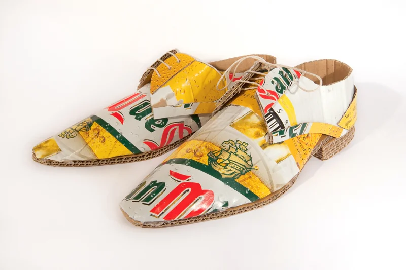 'השיגעון למחזור"' של אמן הקרטון הבריטי מארק אובריאן מיתרגם ליצירות מפוסלות הנעות על קו התפר בין עיצוב, אמנות ואופנה. כך, בסדנת העבודה שלו באזור מנצ'סטר, ארגזי בירה משומשים ממוחזרים בעבודת קראפט לסדרת נעליים תלת ממדית ומתכלה. קו ההנעלה לגברים מאופיין בגזרות, צורניות, גרפיקה וגימור המתרחקים מסממני הייצור התעשייתי ומציבים את האסתטיקה הגולמית והאותנטיות של החומר במרכז הבמה ומחוץ לקופסה.