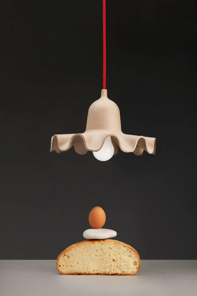 השנדליר "Egg of Columbus" מפגין עיצוב מבוסס על 'ביצת קולומבוס' -מיתוס סיפורי המיוחס לכריסטופר קולומבוס ואתגר העמדת הביצה על חודה. המעצבת Valentina Carretta ממחישה את הצורך בחשיבה מקורית לצורך פתרון בעיות באמצעות סדרת גופי תאורה שעוצבה בשיתוף מחלקת העיצוב של FABRICA, המיוצרת כיום למותג האיטלקי seletti. בהשראת המראה הגלי והמתקפל של מנורות וינטאג' יצרה המעצבת קו תאורה הכולל שלוש נברשות ומנורה שולחנית אחת. את הפריטים בסדרה מרכיבים בית מנורה קראמי, כבל אדום לתלייה, וסיבי קרטון דחוס ועמיד ללחות המושאל מתעשיית האחסון והאריזה. חומר הגלם הממוחזר והמתכלה יוצא מהקונטקסט ומהשימוש המסורתי ומעשיר את הפריטים בחוסן צורני, אסתטיקה קלילה, דקורציה אותנטית וערכיות מקיימת.
