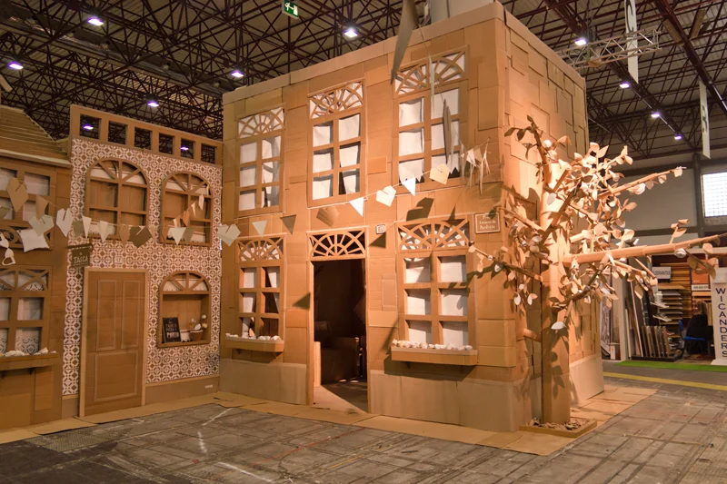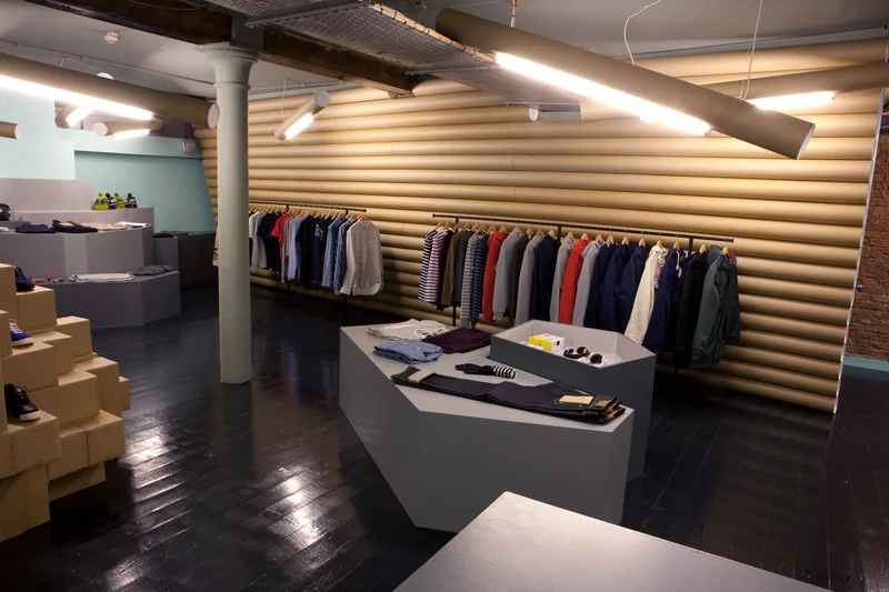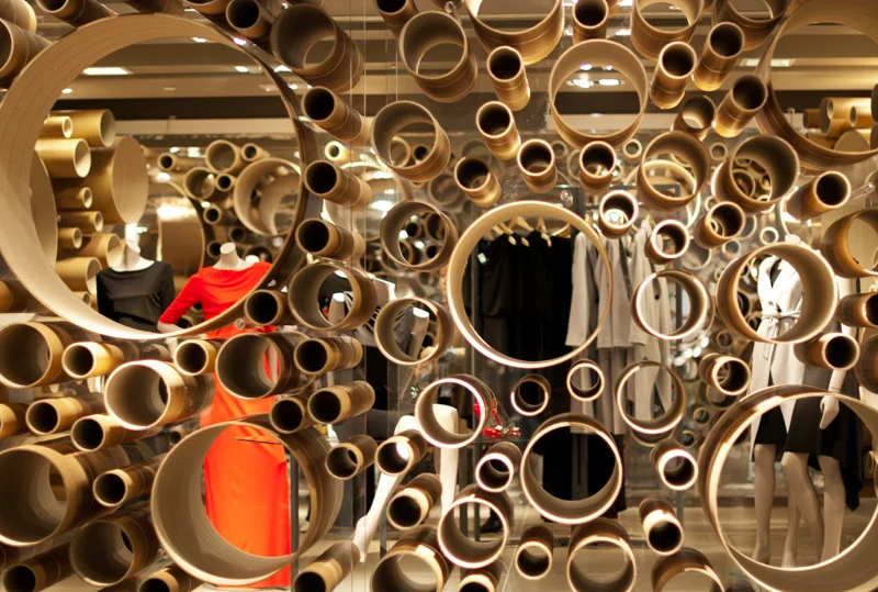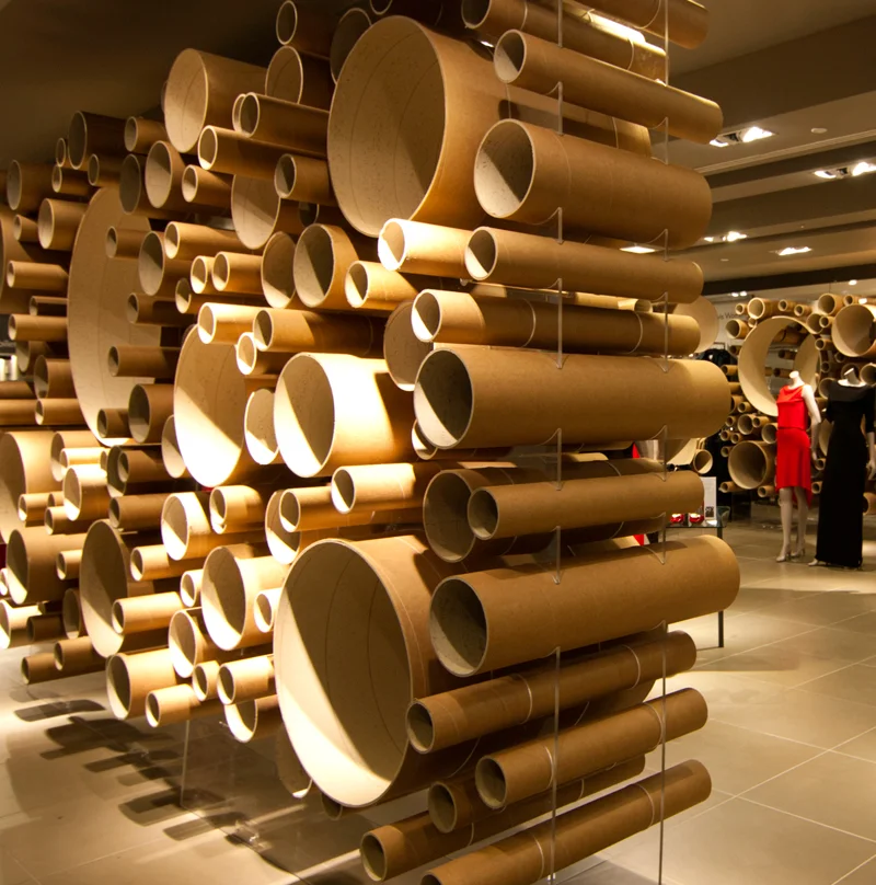 משרד האדריכלים grimshaw מתרגם את תכונות החומר, המרקם והפורמה לגמישות עיצובית ברוח ה'פופ -אפ' בעיצוב ביתן זמני למותג John Lewis בלונדון, בריטניה. למרות הבחירה בחומר גלם עממי, עיצוב החלל אינו שגרתי ומורכב ממשחק עשיר בצורה, בגודל ובחומר, שמשתנה ונע בין צינורות קרטון בגדלים ונפחים משתנים לבין שתי יריעות אנכיות ואקריליות. אלמנטים אלו מייצרים מסגרת פשוטה אך מתוחכמת לתצוגה, בהיבט של עלויות ייצור, הובלה, התקנה, הצבה ופירוק ההתקן. שפת עיצוב גמישה ודינאמית, לצד קומפוזיציות רב-גוניות השואבות מעולמות הארכיטקטורה, העיצוב והאופנה.