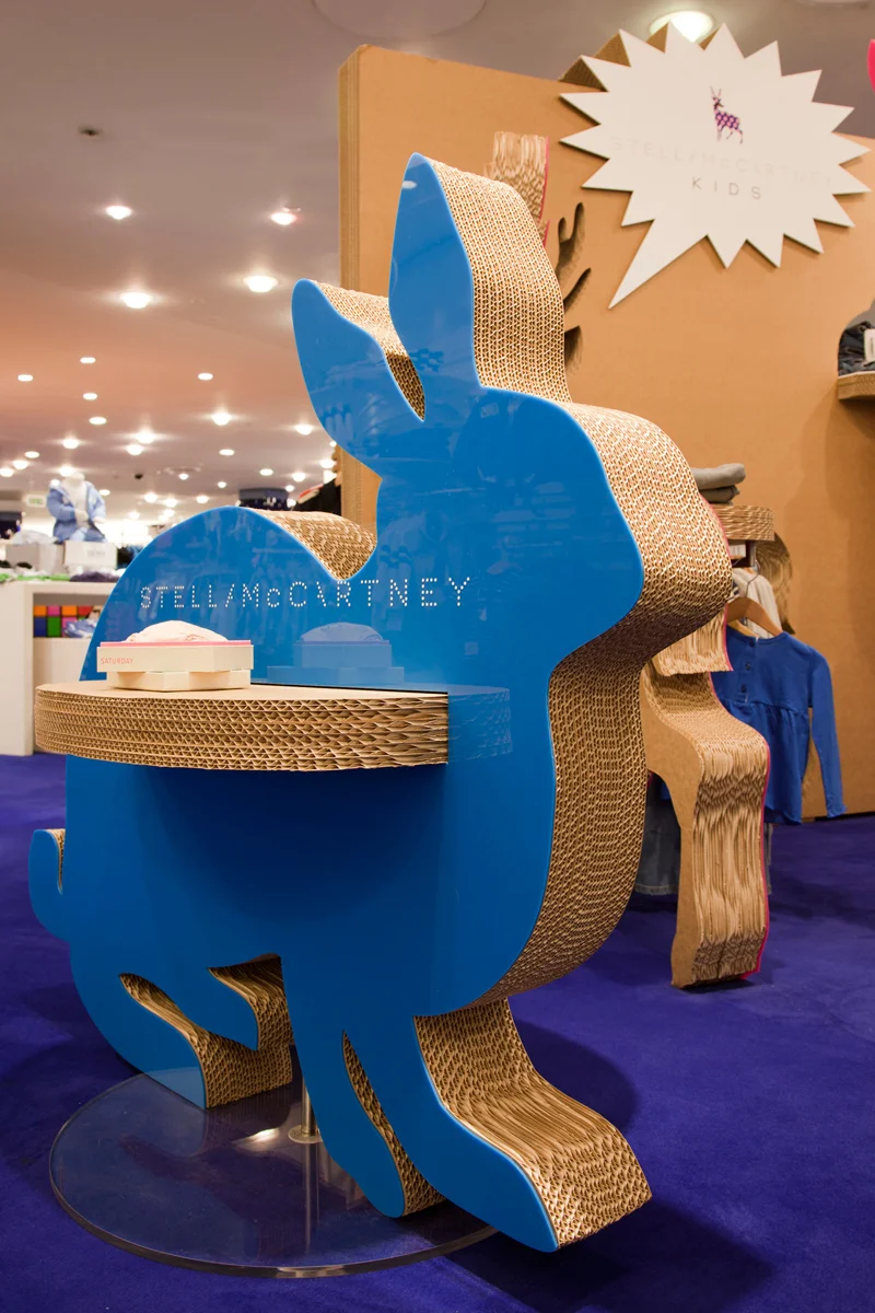 מעצב הרהיטים Masters Peter מכניס את הקרטון אל תוך זירת העיצוב המסחרי בעיצוב פנים לרשת החנויות הבריטית Smithfield. טכניקות מסורתיות ותהליכי ייצור פופולאריים, לצד חומרים מקיימים וזמינים, מושאלים מתעשיית הייצור והעיצוב (ביניהן שימוש במכונות לייצור כינורות) ומשמשים כלי מקורי ליצירת פורמות מורכבות המיוצרות בעבודת יד מקרטון באטלייה שבבריטניה. בקו העיצוב של חנות האופנה לגברים שבמנצ'סטר, לוקח המעצב את המדיה המסחרית למחוזות ירוקים מקרטון ממוחזר, כאשר הבחירה בקרטון כחומר גלם יחידני השולט בשפת העיצוב אינה מקרית אך בהחלט מקורית. מתוך טיפול ייחודי וברוח המקיימת מתרגם המעצב את חומר הגלם הנפוץ לחוויית קניה מלאת חן, הומור, ומינימליזם המועשר בפתרונות אקו-חזותיים: מקופסאות תצוגה וחיפויי קיר ועד לאובייקטים מפוסלים במראה כלבים שעוצבו בהשראת לוגו המותג.