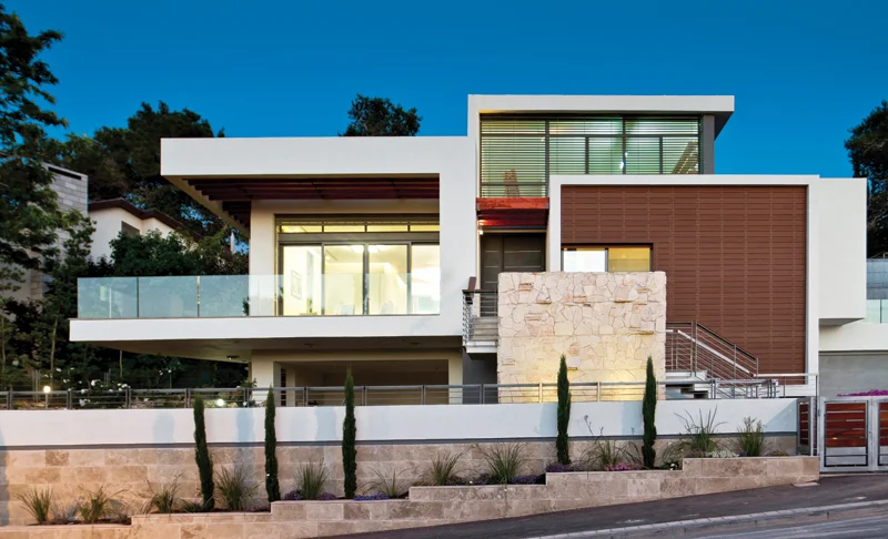 חיפוי במראה עץ משתלב עם חיפוי הטיח ונוסך חמימות לקוויו המודרנים - נקיים של המבנה.
